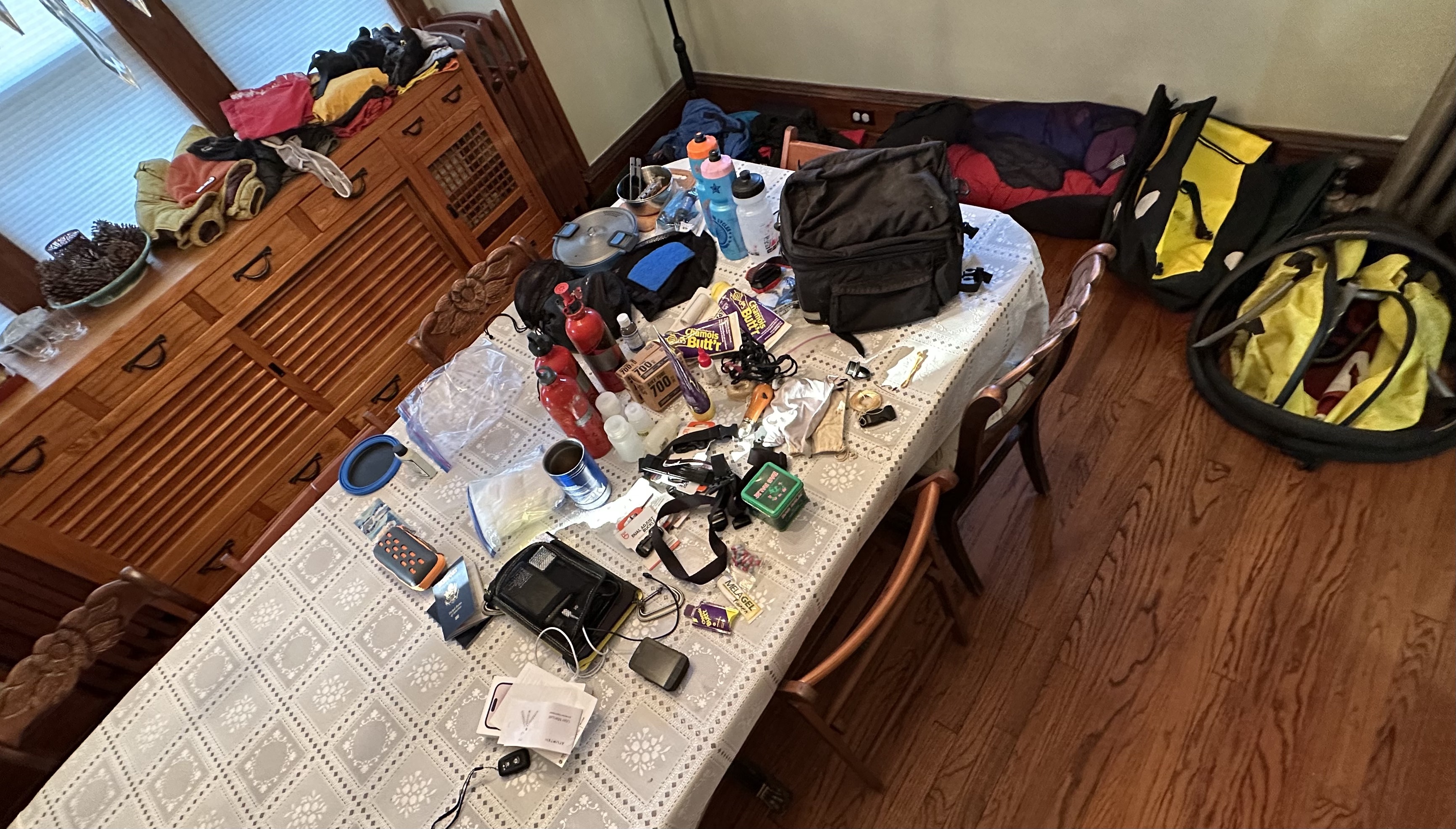 The goal on the tandem is to go light. And really, the simplicity of having only what we need and nothing (well, little) superfluous is part of the appeal of this kind of travel. But like most simple things, it takes intension and work to make the complex into the simple. So…we explode potential gear all over the dining room and live with it for a few days. Every time we walk by we think “yeah, do I need that?” or “wow, we are missing this thing.”